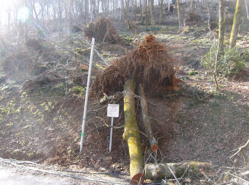 Tour des Baronnies 10 mars 2015 031J’ai continué ensuite de l’autre côté avec la descente sur Banios. Sur toute la descente du col des Palomières comme sur la fin de la montée, j’ai vu une multitude d’arbres qui étaient tombés sur les lignes électriques qui bordent la route. Il a dû tellement pleuvoir ces dernières semaines que les arbres se sont déracinés tellement la terre était gorgée d’eau. En tout cas dans la descente, ça ressemblait à un champ de bataille avec tous ces arbres couchés, les lignes électriques au sol et les brindilles qui recouvraient la route. Après le gros de la descente, alors que je roulais sur une route très étroite avant de commencer la montée du Couret d’Asque, quelle surprise de croiser….un poids lourd !!! Mais qu’est ce qu’il faisait ici?!! C’était très limite, j’ai pilé et j’ai dû passer dans l’herbe.
