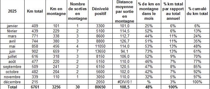 Je termine l’année avec 6761 km au compteur et 80650 m de dénivelé dont 3256 km en montagne pour 30 sorties de 108,5 km en moyenne. C’est au total, 1700 km de plus que l’an dernier.