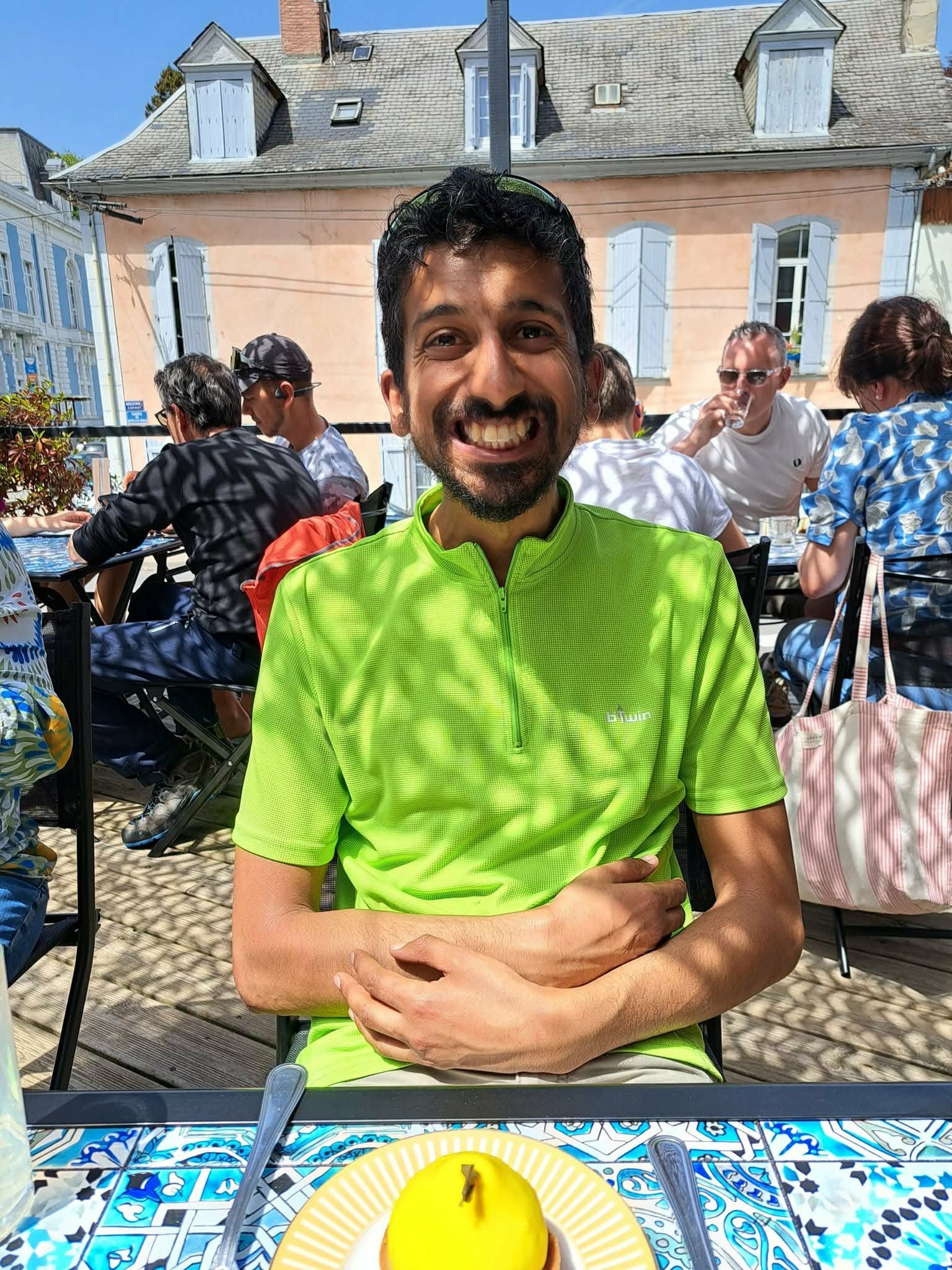 En traversant Bagnères, je dois mettre pied à terre car il y a pile l’arrivée d’un trail devant les thermes. Là je croise Christian qui est venu voir l’arrivée de son fils. On discute quelques minutes puis je continue de me faufiler pour rejoindre le resto où elles sont.